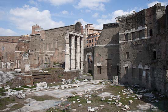 Initially, during the second century and more precisely in 107 AD, mainly thanks to the efforts of emperor Trajan, a unique period of construction began at the Fora. It was Apollodorus of Damascus who designed this area of the Fora. Particularly fascinating is the site of the market, with the still recognizable remains of the tabernae, which grow mainly along the so called via Biberatica. In the Forum were found the Greek and Roman libraries, the temple of Trajan and the Basilica Ulpia, of which remain traces of the paving of coloured marble. Remember that the basilica was once a civil and not a religious building, while the main material used was clay brick.