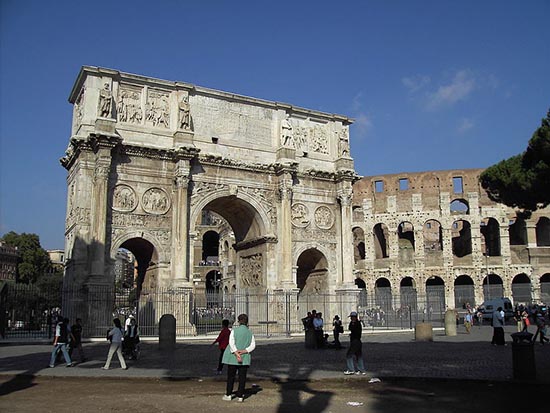 El Arco de Constantino en cambio es un arco de triunfo de 21 metros de altura, con tres arcos (o tres aperturas), que está a pocos pasos del Coliseo. El arco fue construido por orden del Senado Romano para celebrar y conmemorar la victoria de Constantino contra Majencio. Se trata de la famosa batalla del Puente Milvio que tuvo lugar en el año 312.